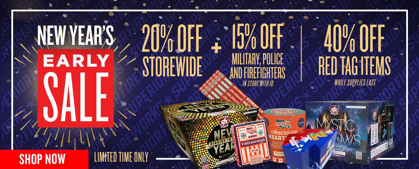 Get ready to celebrate with Superior Fireworks during our New Year's Early Sale! Shop incredible savings on hundreds of fireworks storewide to get the best deals, the best selection, and best shopping experience of the season.